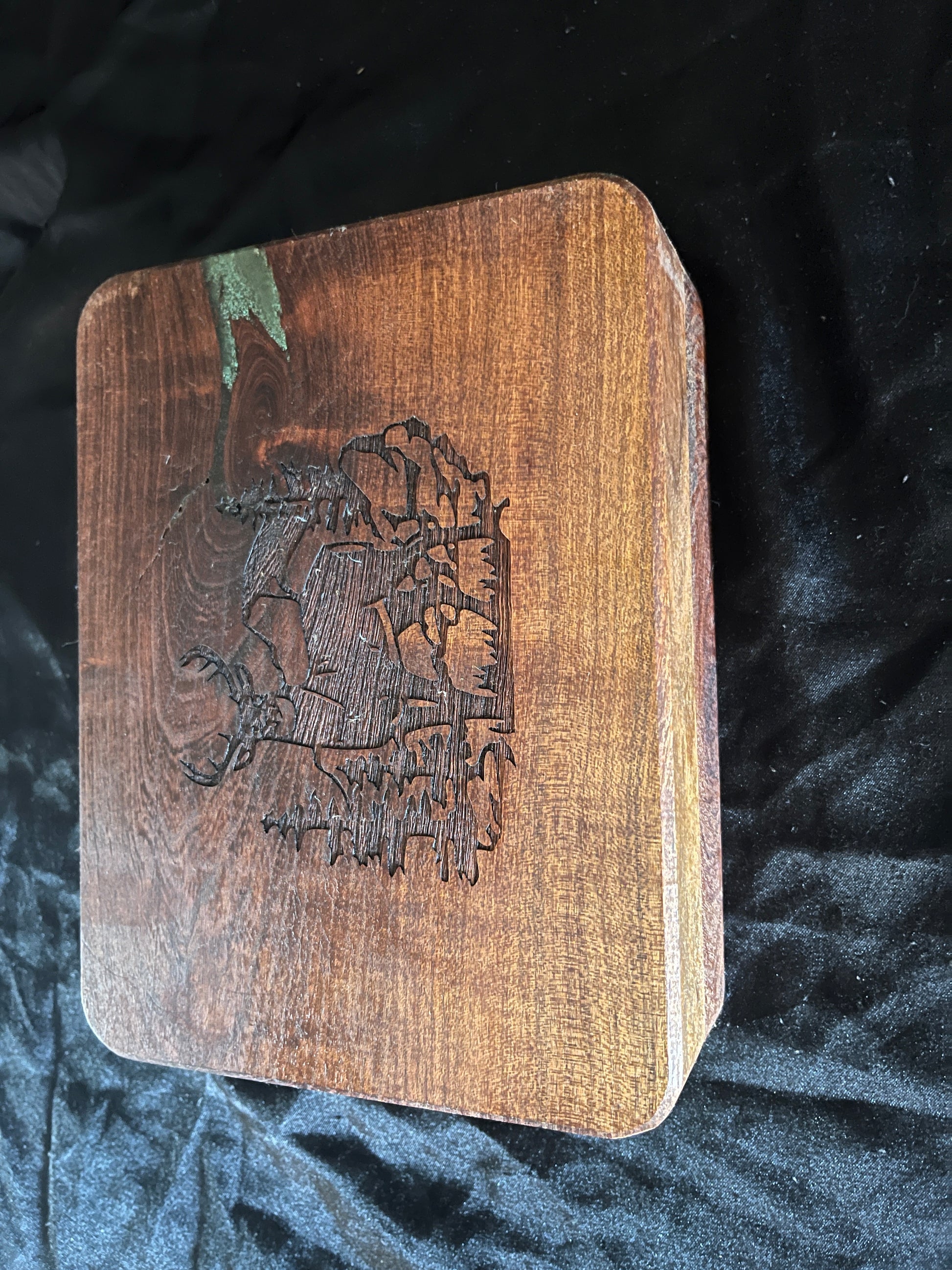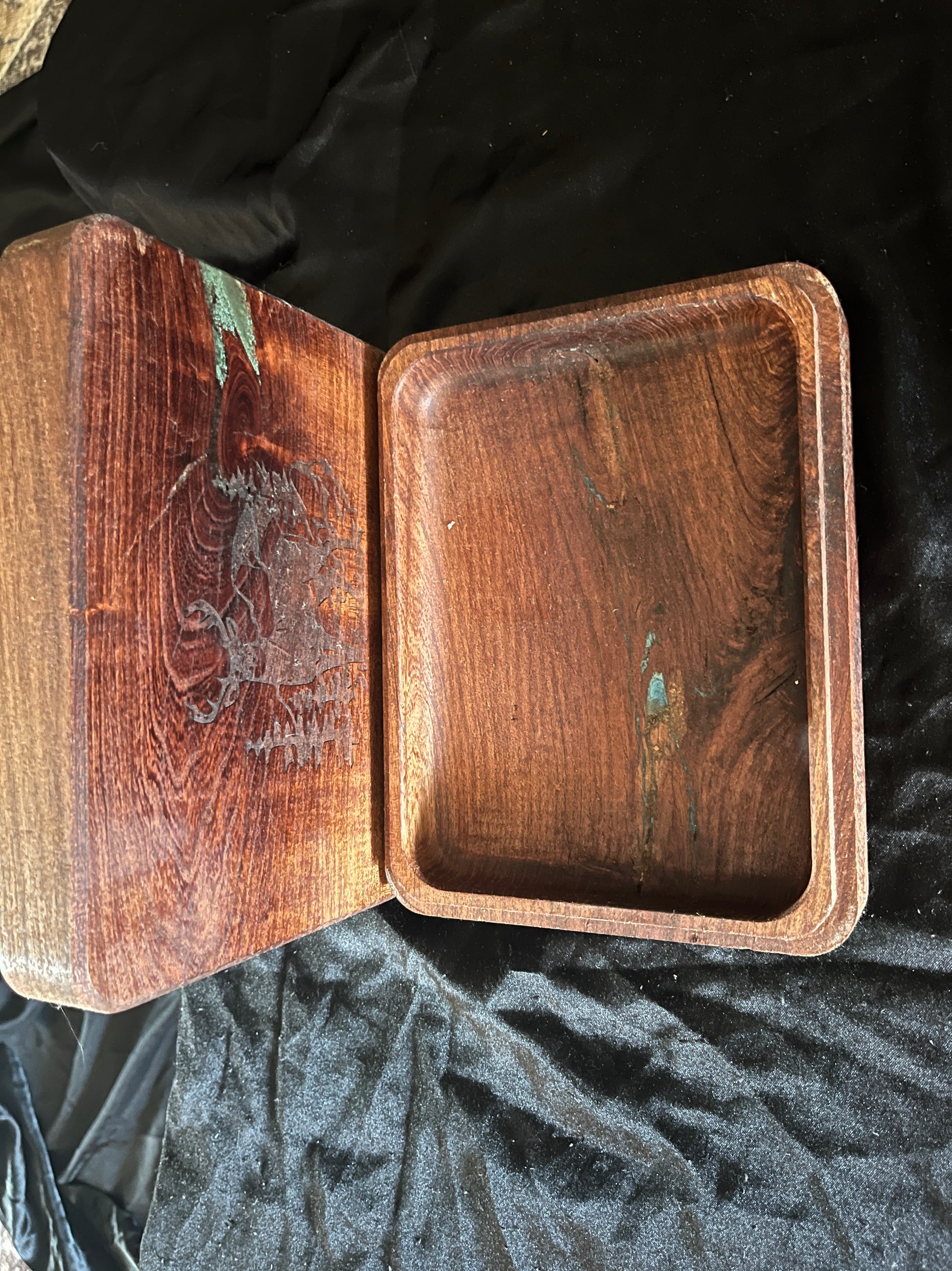 My mesquite boxes are cut on my Industrial CNC. I can do pretty much any size and shape that you want. The ones on this site are 7" x 9" x approximately 2" thick and 4.5" x 19" x approximately 2". The boxes on here have a deer scene engraved on them but I can also personalize them with either my cnc or laser engraver.